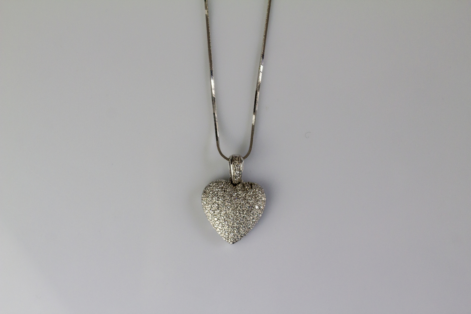 Ciondolo a cuore con catena in oro bianco18kt, gr 12.74. Diamanti cts 0.94. ....