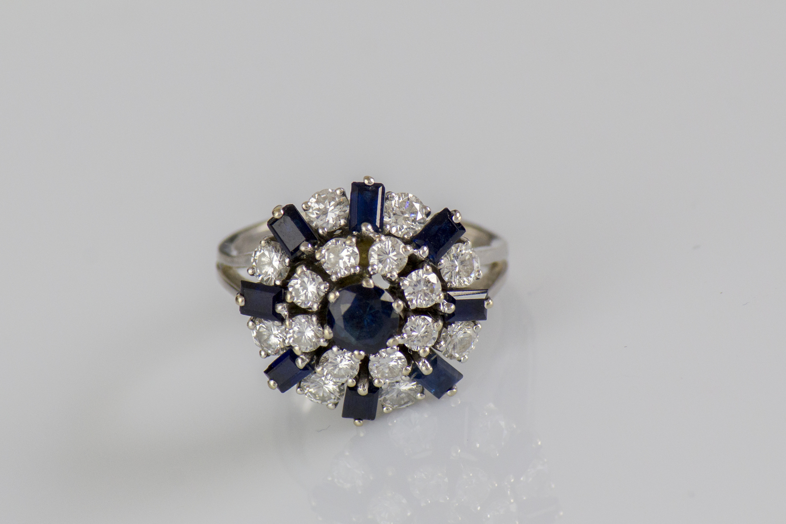 Anello in oro bianco 14kt, gr 6.90. Zaffiri baguette e zaffiro centrale taglio brillante. Diamanti cts 1.35. . .