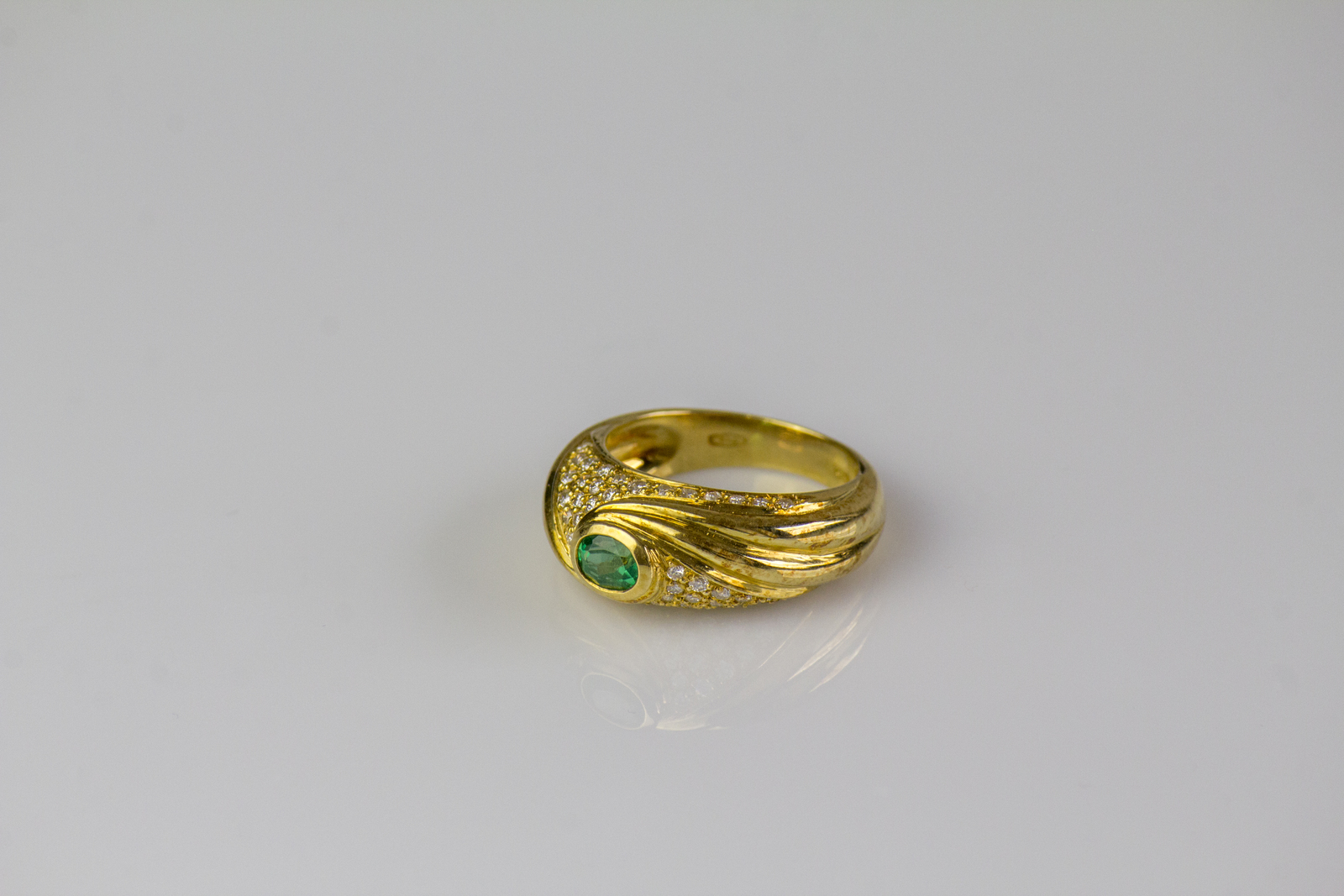 [Nessun Autore] Yellow 18kt gold ring, gr 8.40. Diamonds cts 0.45 approx. Emerald cts 0.20. . .