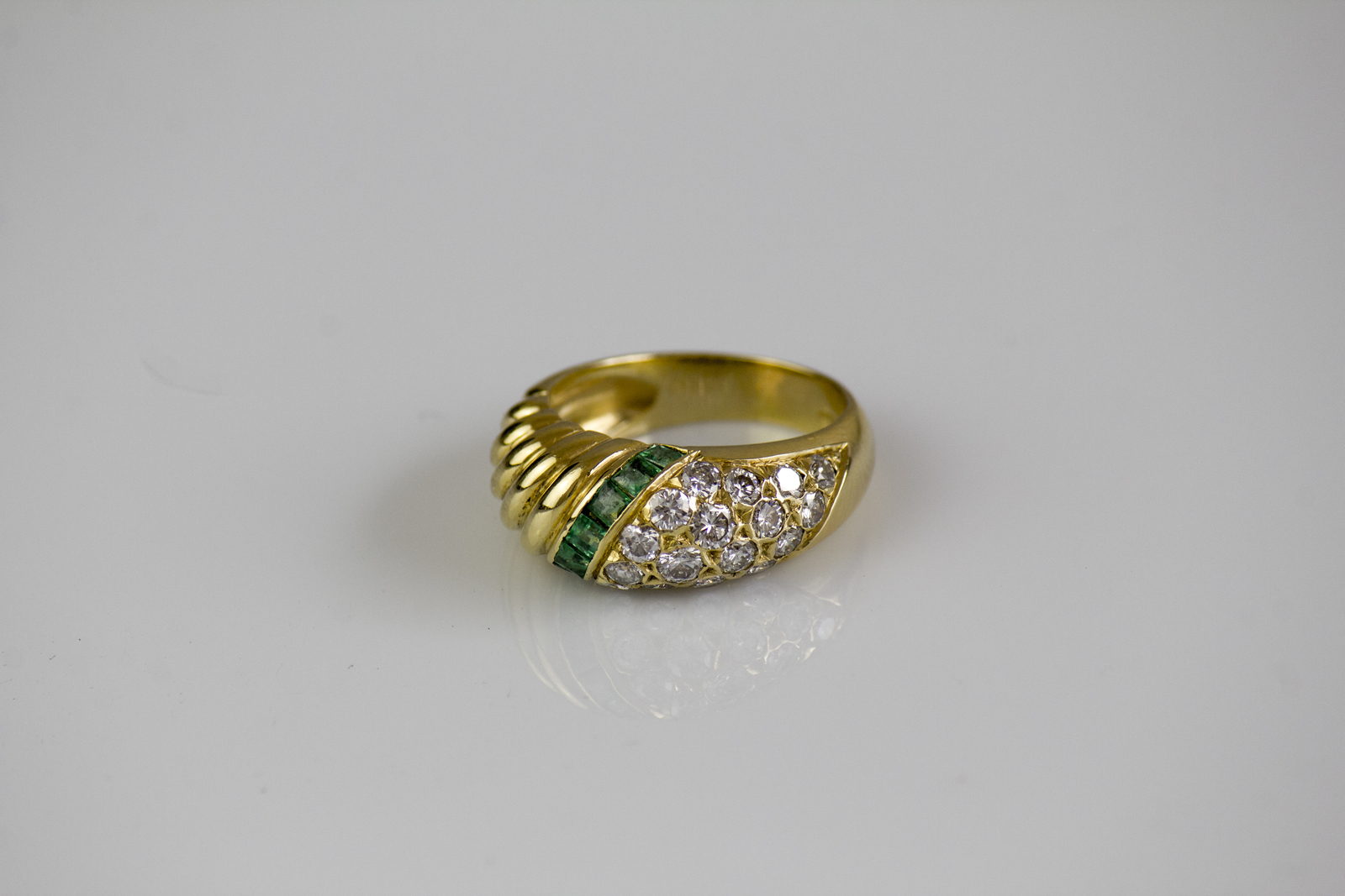 [Nessun Autore] Yellow gold 18kt ring, gr 4.90. Diamonds cts 0.40 approximately. Emeralds cts 0.38 approximately. . .