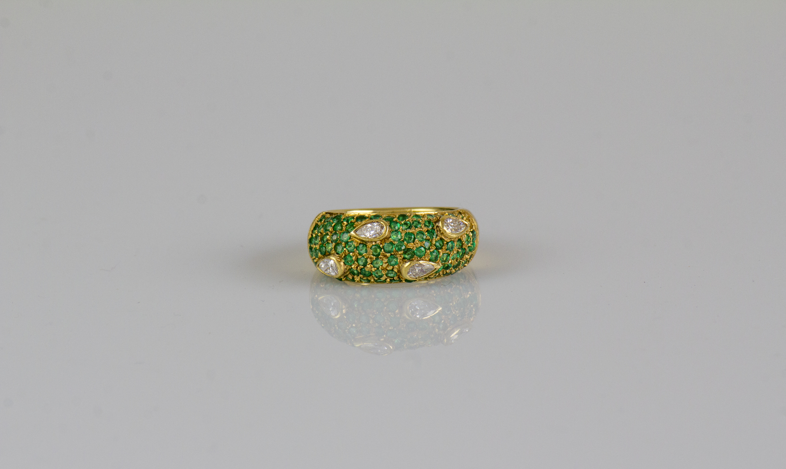 [Nessun Autore] Yellow 18kt gold ring, gr 6.40. Diamonds cts 0.62. Emerald cts 1.60. . .