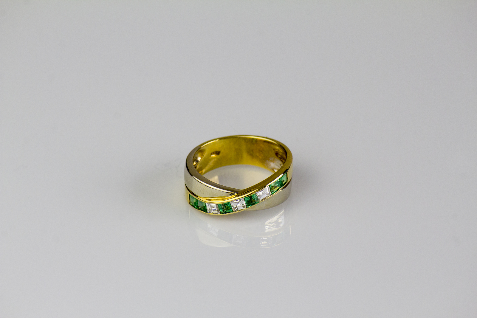 [Nessun Autore] Yellow and white 18kt gold ring, gr 6.90. Emeralds cts 0.54. Carré diamonds cts 0.40. . .