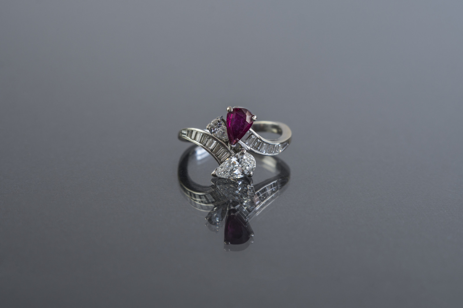 [Nessun Autore] 18kt gold contrarié ring, gr 3.90, with pear diamond cts 0.50 approx. Baguettes diamonds cts 0.70 and pear ruby cts 0.88. . .