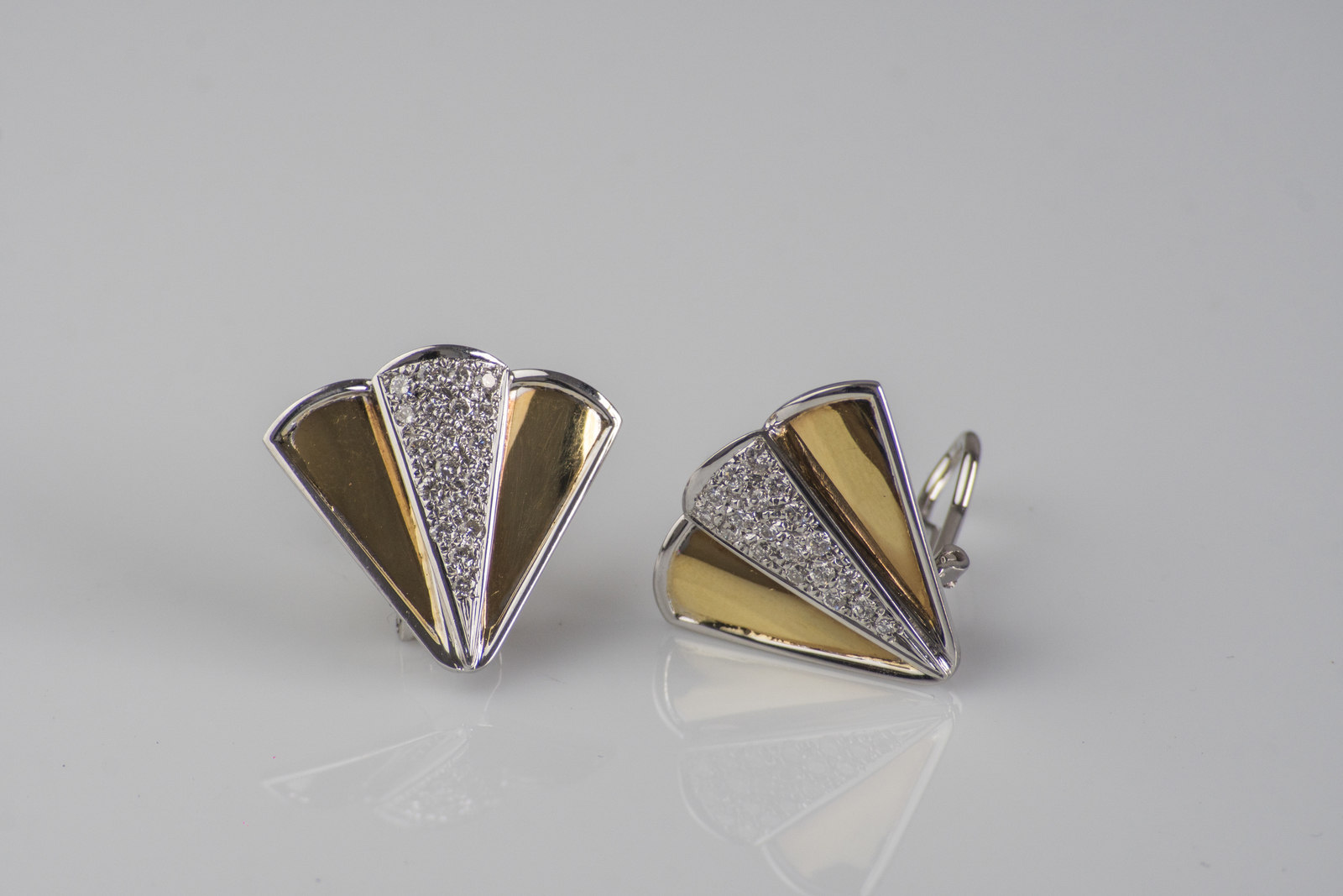 Orecchini in oro giallo e bianco 18kt a ventaglio, gr 13.10. Diamanti cts...
