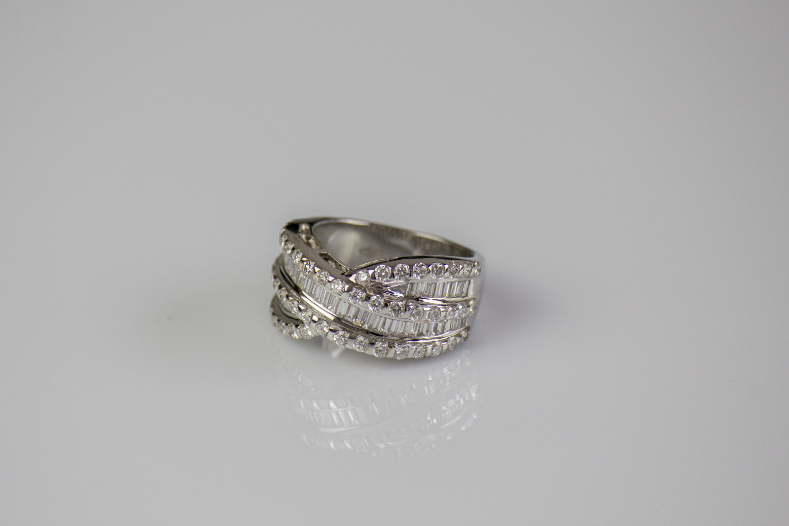 Anello in oro bianco 18kt, gr 13.70. Diamanti taglio brillante cts 1.15. Diamanti baguettes cts 2.25 circa. . .