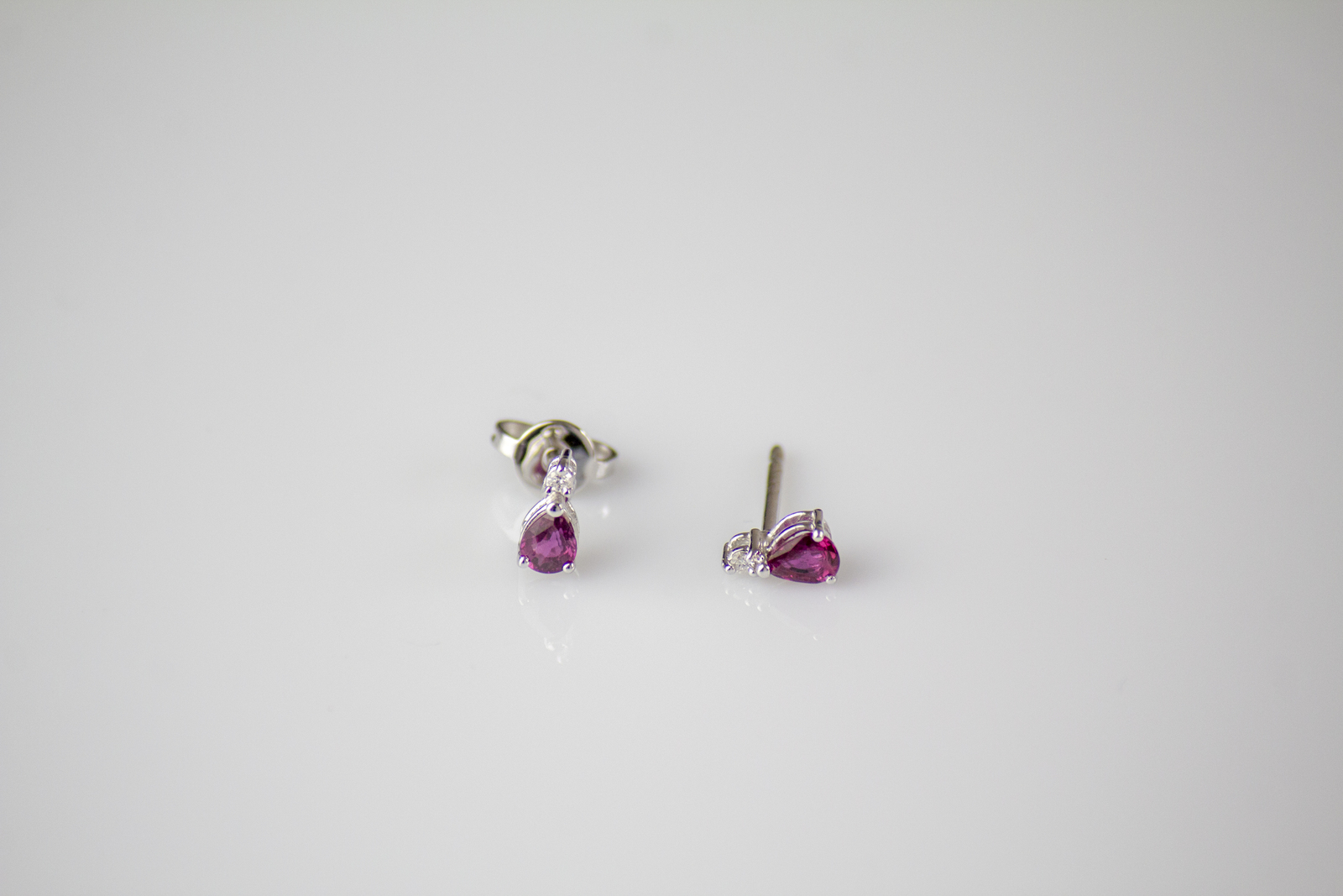 Orecchini in oro bianco 18kt, gr 1.29, con rubini a goccia cts 0.43. Diamanti...