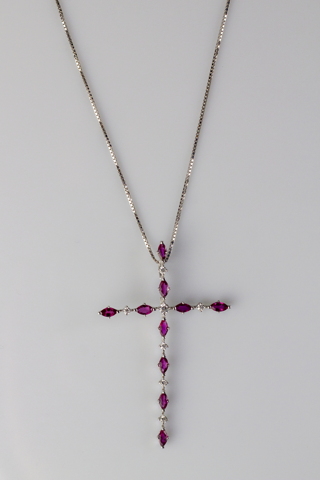 [Nessun Autore] Chain with 18kt white gold cross pendent, gr 5. Navette cut rubies cts 1.34. Diamonds cts 0.23. . .