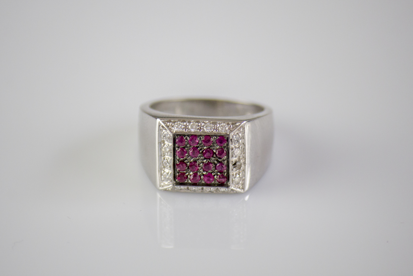 [Nessun Autore] 18kt white gold ring, total gr 10.10. Diamonds cts 0.24. Rubies cts 0.52. . .