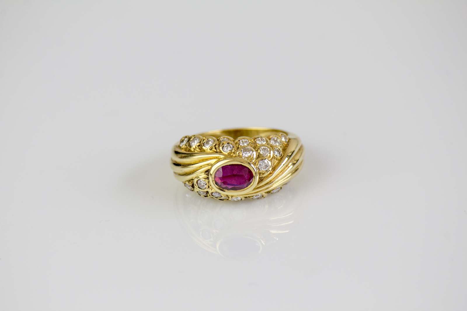 [Nessun Autore] Yellow gold 18kt ring, gr 9.70. Rubies cts 0.90. Diamonds cts 0.70 approx. . .