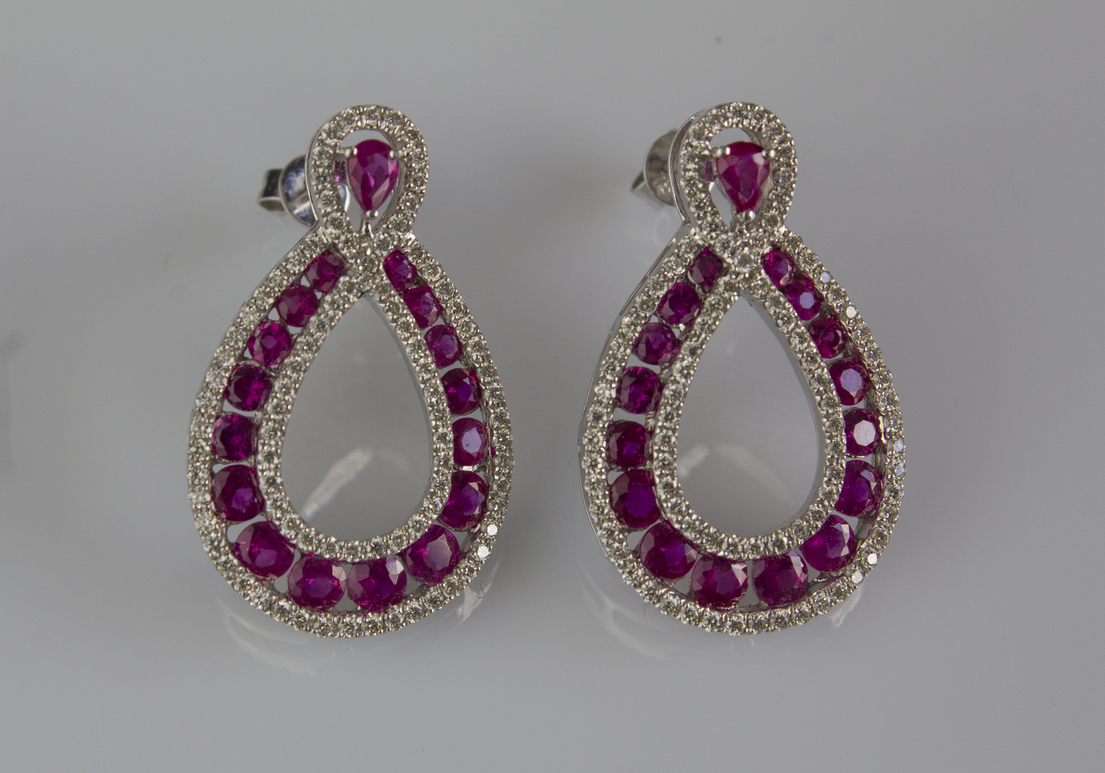 Lot 433 | Paio di orecchini in oro bianco 18kt, gr 12, con rubini cts 3.58. Diamanti...
