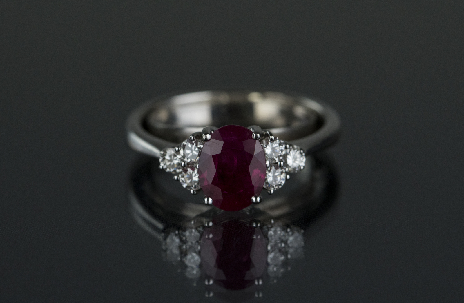 [Nessun Autore] Anello in oro bianco gr 5.10 con rubino cts 1.20 circa e brillanti cts 0.30. -. .