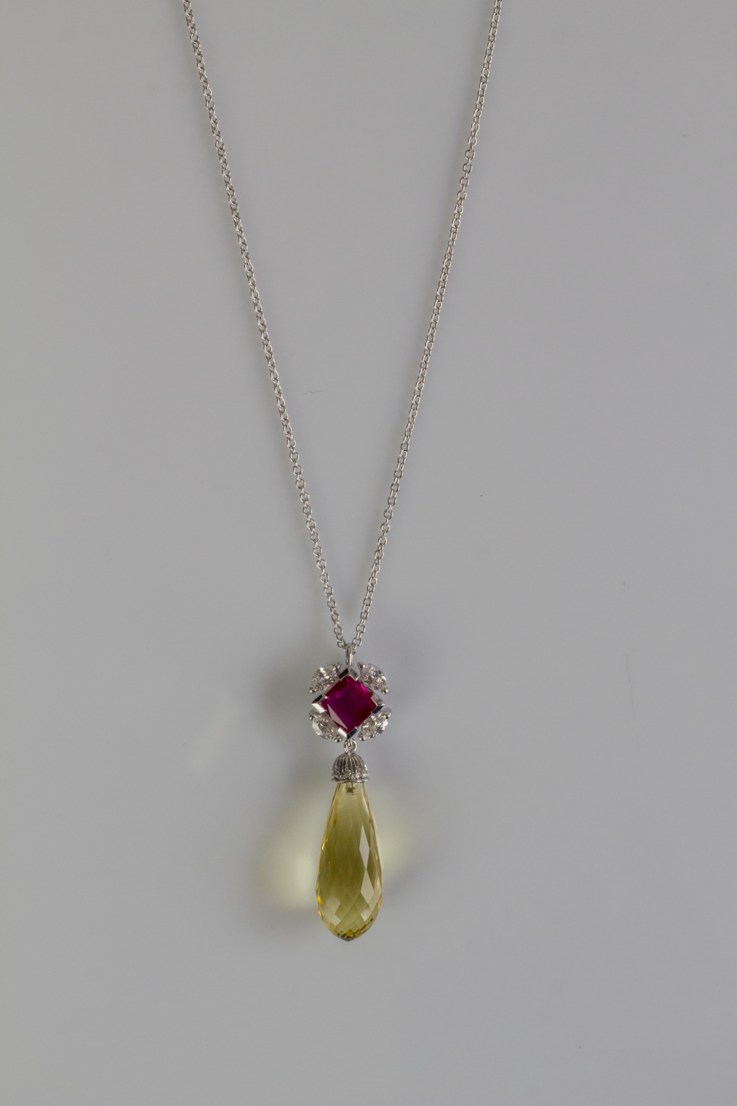 [Nessun Autore] White 18kt gold necklace, gr 5.20, with diamonds cts 0.33. Citrine quartz briolette and ruby cts 1.45. . .