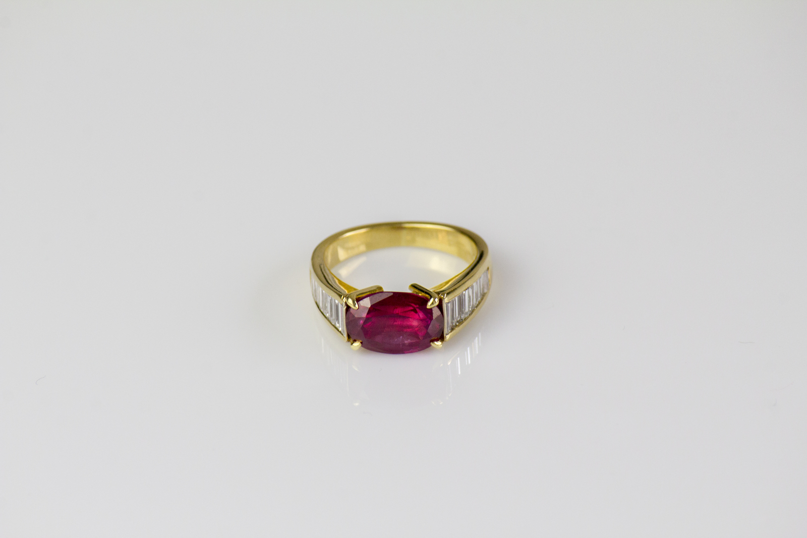 Anello con rubino centrale cts 4.14, fiancheggiato da diamanti baguettes cts 1.19. . .