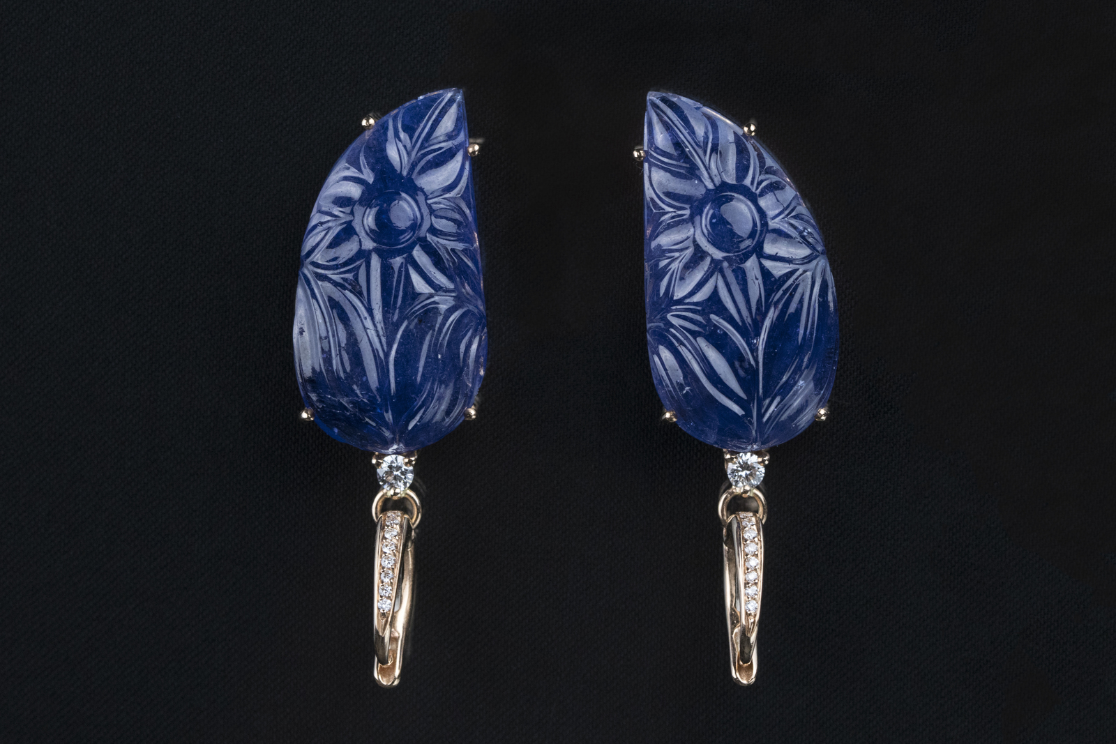 [Nessun Autore] 18kt gold earrings, gr 4.80 with 2 graven tanzanites cts 48.47. Diamonds cts 0.20. . .