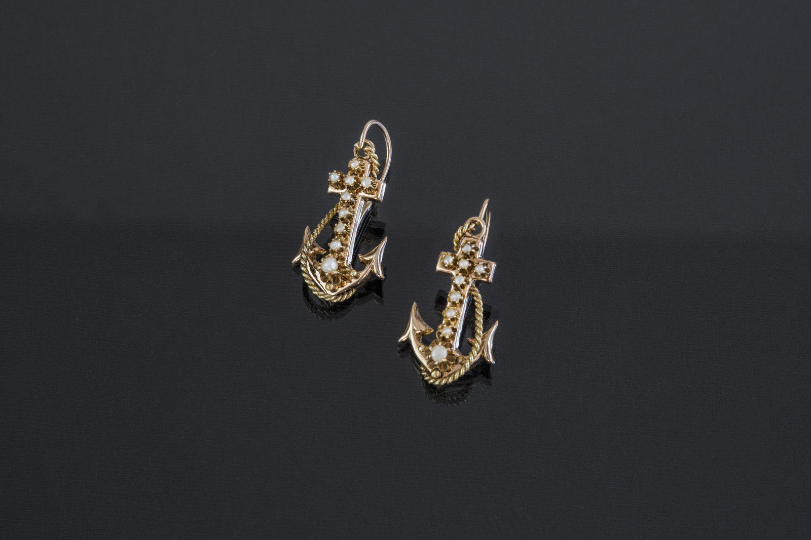 [Nessun Autore] Yellow gold anchor shape earrings with cross made of pearls. . .