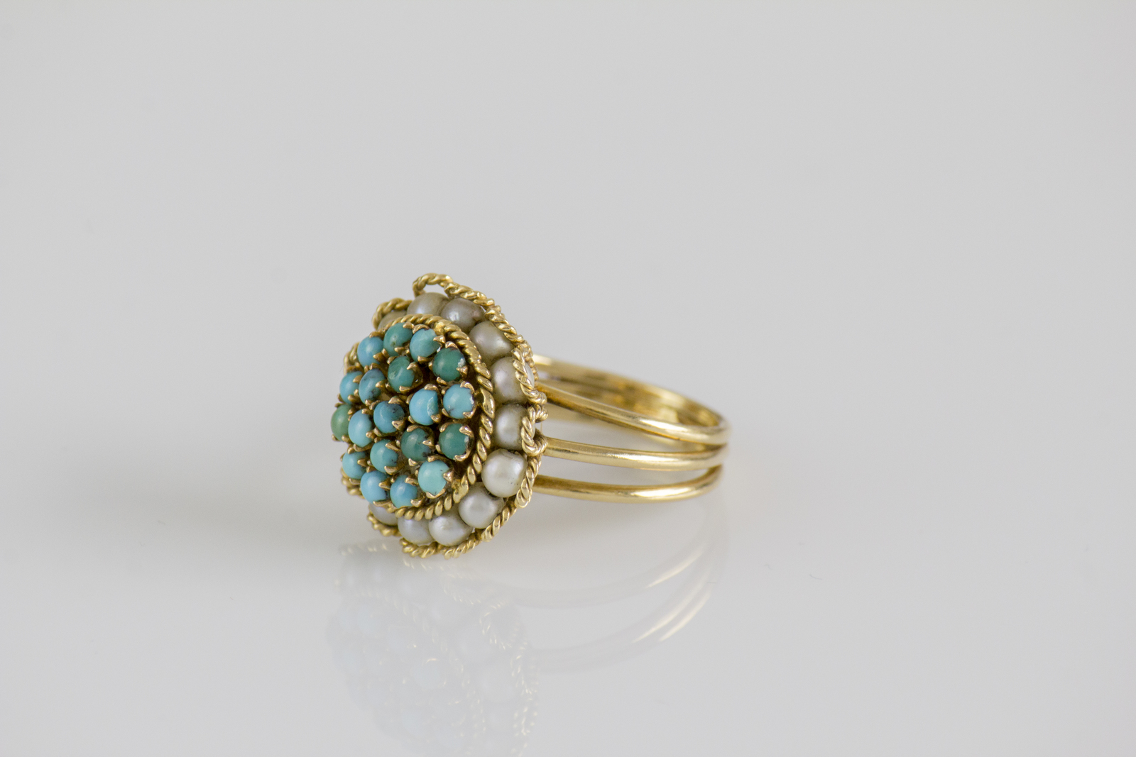 Lot 462 | Anello in oro giallo 18kt, turchesi e perline, gr 8.20 complessivi. . . ....