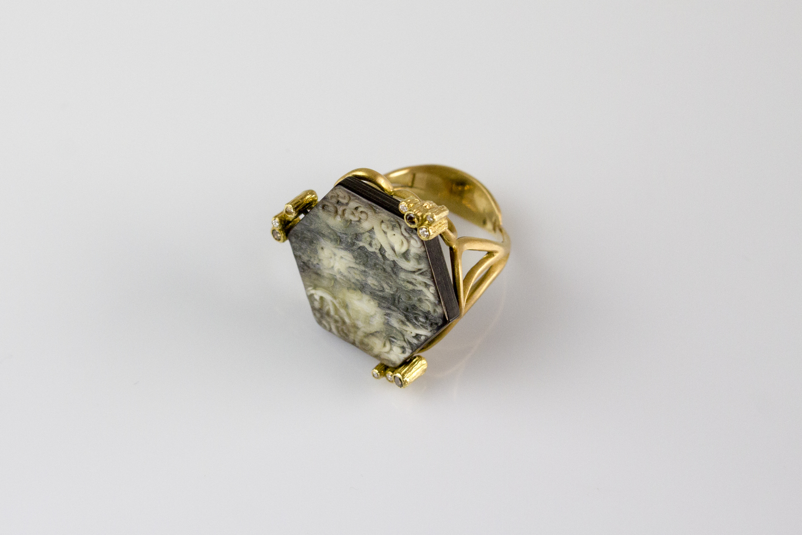 Anello in oro, gr 10.1. Diamanti cts 0.16 e madreperla incisa. Firmati leaderline.