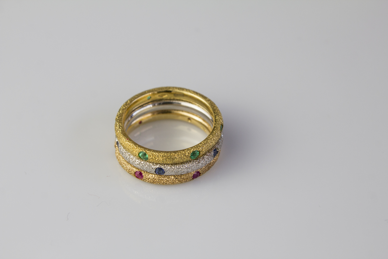 Trittico di Fedi in oro bianco, giallo e rosa di gr 9,70, con zaffiri, smeraldi e rubini. . .