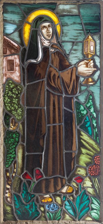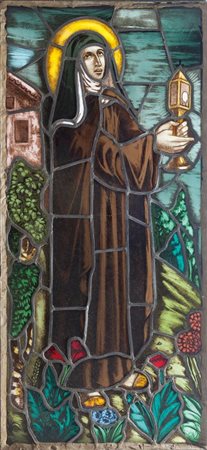 UNA VETRATA, anni '50. Lastre di vetro policromo legate al piombo, cornice di...
