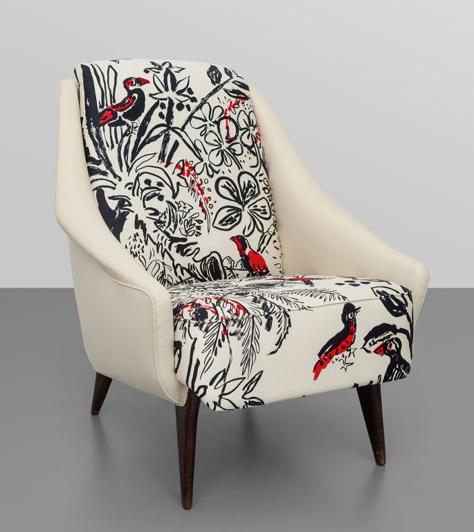 UNA POLTRONA, anni '50. Struttura e gambe in legno, imbottiture rivestite in...