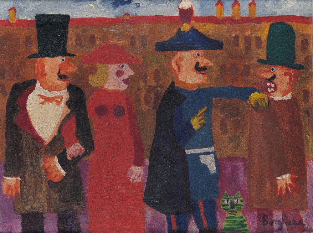 FRANZ BORGHESE Roma 21/01/1941 - Roma 17/12/2005 - Sfida a duello, olio su tela cm. 30x40, firma in basso a destra, timbri della Galleria Cannocchiale (MI) al retro, opera registrata presso l'Archivio Generale Franz Borghese come da dichiarazione su foto.