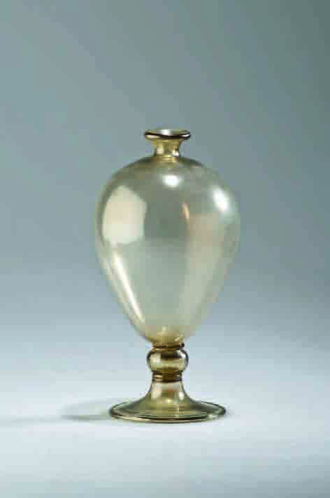 Vittorio Zecchin Vaso “Veronese” in vetro pagliesco lievemente iridato, 1921 circa, altezza cm 24 Vittorio Zecchin prese ispirazione per questa forma semplice e classica da un modello cinquecentesco, un vaso accanto alla Vergine nel dipinto L’Annunciazione (Venezia, Gallerie dell’Accademia) opera del pittore Paolo Caliari detto il Veronese. Da qui il nome del vaso che divenne il simbolo della Venini.