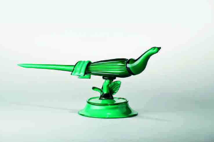 Napoleone Martinuzzi Figura di fagiano stilizzato in vetro incamiciato verde su base circolare, 1928 circa; cm 20x48 Bibliografia: A. Diaz de Santillana, Venini: catalogo ragionato 1921-1986, Milano, 2000, pag. 67; n. 11