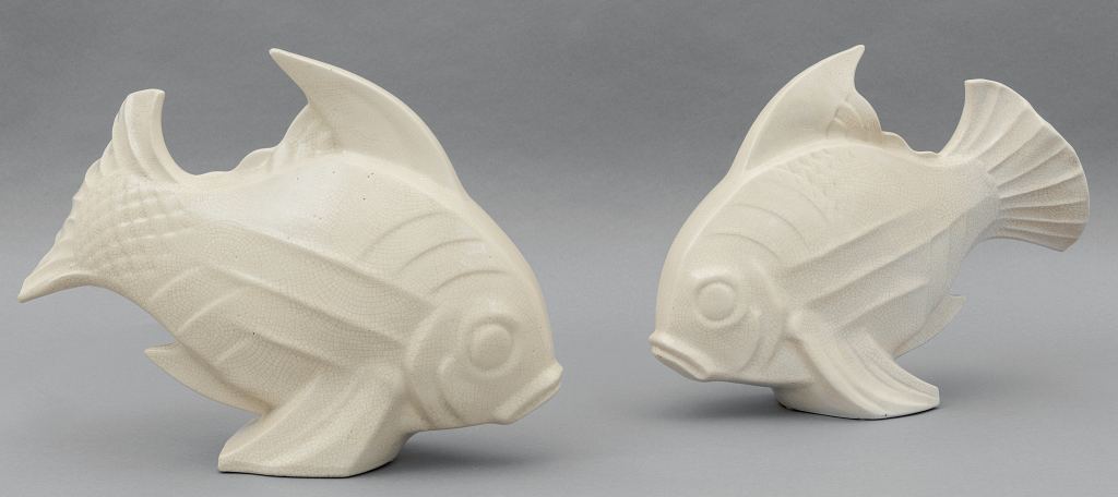 DUE FIGURE DI PESCI Ceramica formata a stampo con smalto avorio cracquelé....