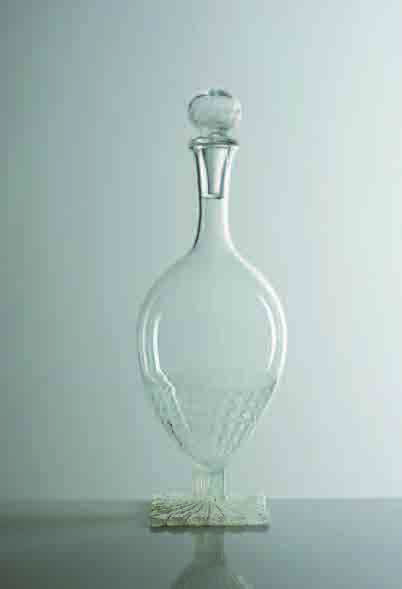 Paolo Venini Bottiglia in vetro trasparente a incalmo con base e tappo in vetro zanfirico, 1934/1935. Firma ad acido: Made in Italy, altezza cm 33 Bibliografia: F. Deboni, I vetri Venini, Torino, 2007, fig. 65