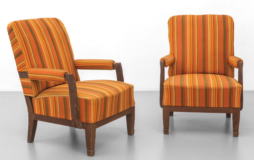 PIERLUIGI COLLI Due poltrone, anni "30. Strutture in legno, imbottiture...