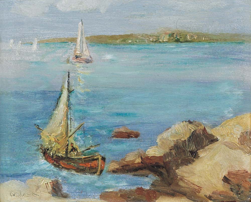ANTONIO CORPORA Tunisi (Tunisia) 15/08/1909 - Roma 06/09/2004 - Vele sul mare, 1937, olio su cartone cm. 22x27, firma in basso a sinistra, opera registrata presso l'Archivio Antonio Corpora come da dichiarazione a cura della Galleria Giovanni Di Summa (Roma) su foto.