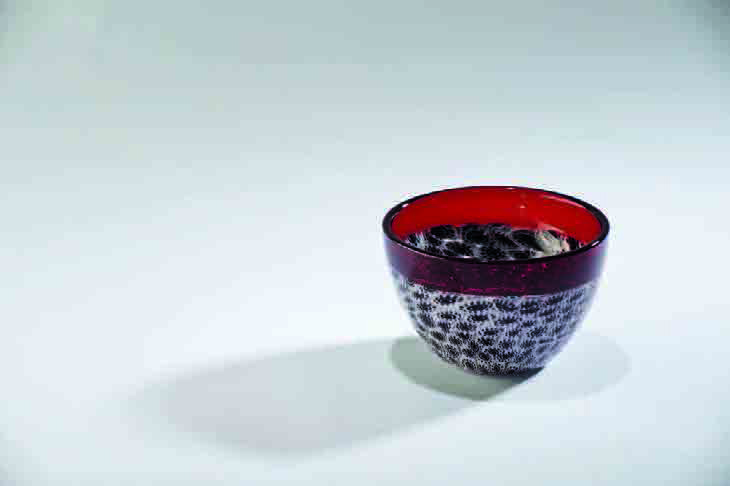 Riccardo Licata Coppa in vetro a incalmo, con fascia a murrine bianco e nero e orlo in vetro rosso, 1955/1956. Reca l’etichetta cartacea: Venini Murano Venezia Made in Italy n. 3613, cm 8x12