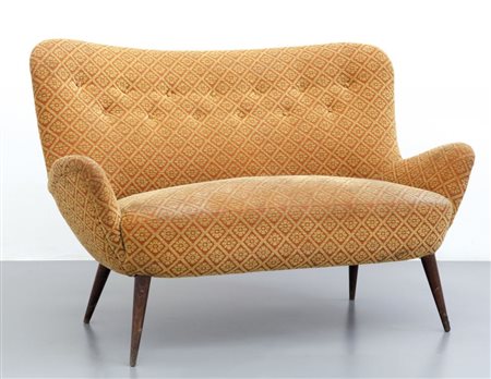 UN DIVANETTO, anni '50. Struttura e gambe in legno, imbottitura rivestita in...