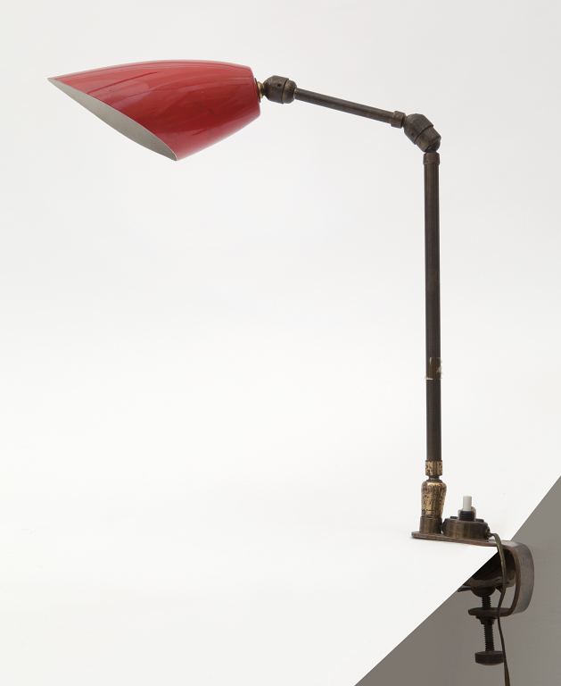 UNA LAMPADA DA TAVOLO A MORSETTO, anni '50. Ottone, alluminio laccato....