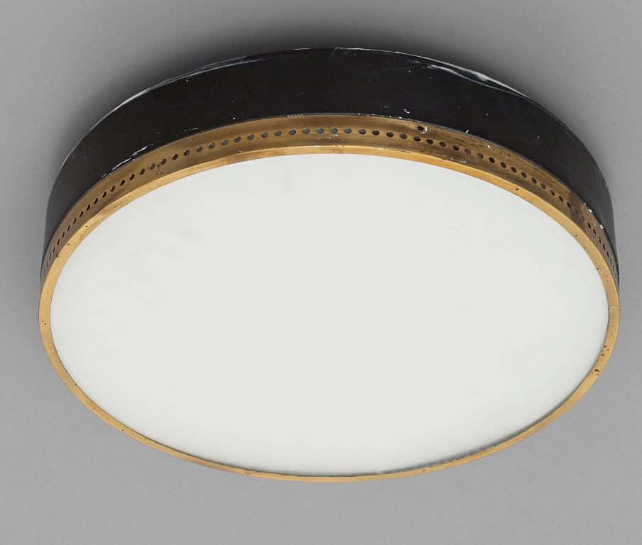 UNA PLAFONIERA, anni '50. Alluminio laccato, ottone, vetro stinato. Altezza...