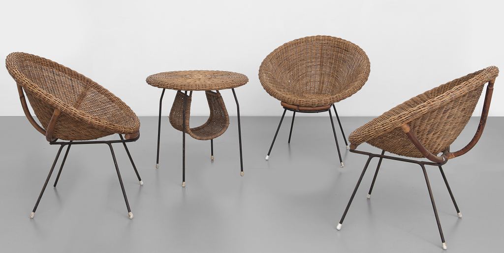 TRE POLTRONCINE E UN TAVOLINO, anni "50. Ferro verniciato, midollino....