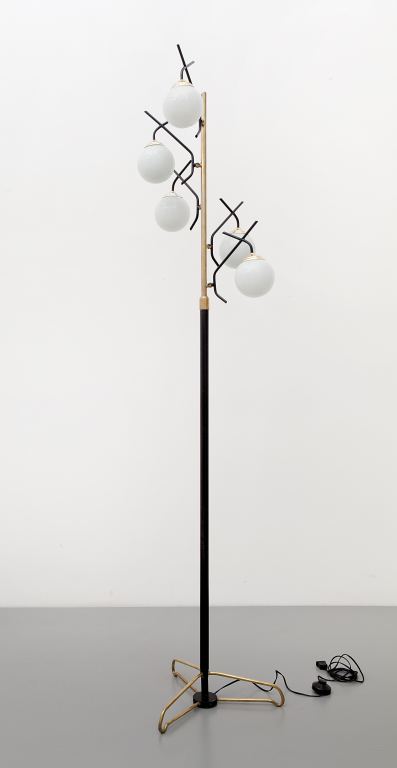 UNA LAMPADA DA TERRA, anni "50. Ottone, ferro verniciato, vetro opalino....