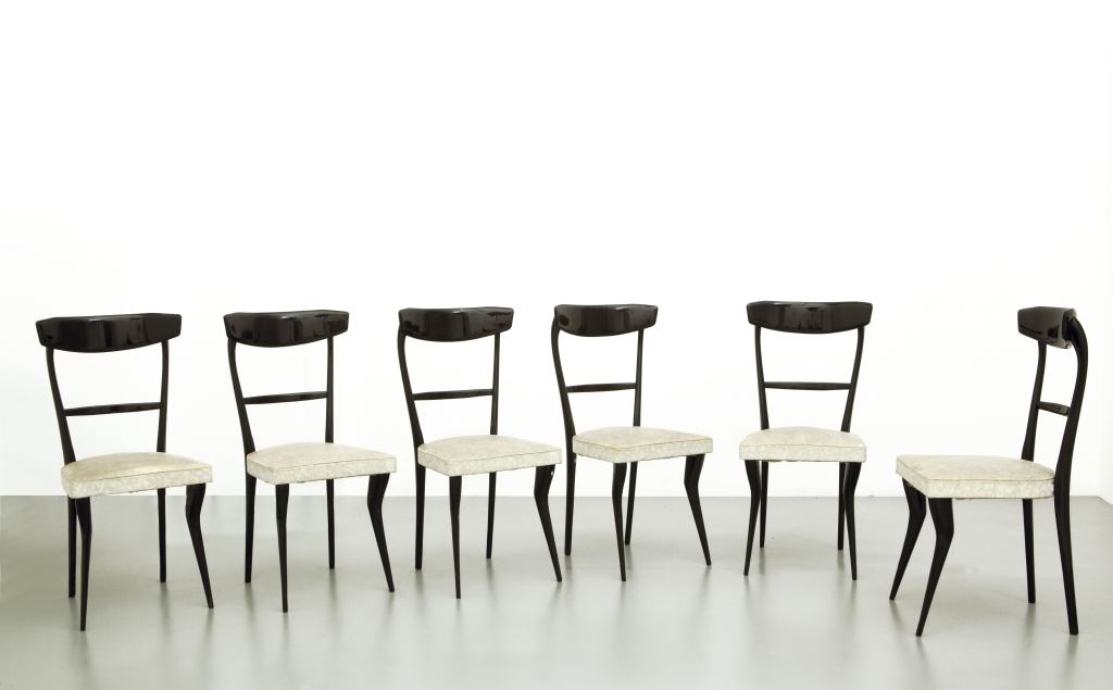 UN INSIEME DI SEI SEDIE, anni "50. Legno tinto all"anilina, sedili...