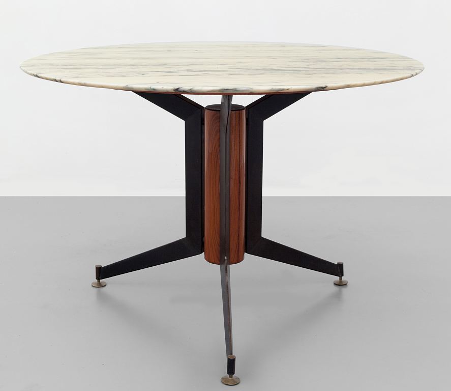 UN TAVOLO, anni "50. Ferro verniciato, piedini regolabili di ottone, legno di...