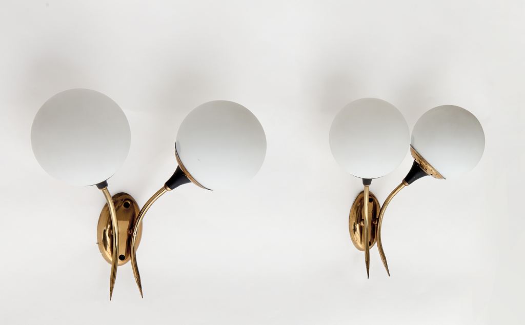 QUATTRO LAMPADE A PARETE, anni "50. Ottone, alluminio laccato, vetro opalino...