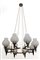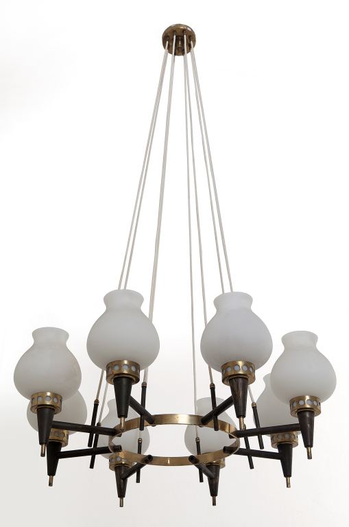 UN LAMPADARIO, anni "50. Ottone, vetro opalino satinato, sospensione a cavo....