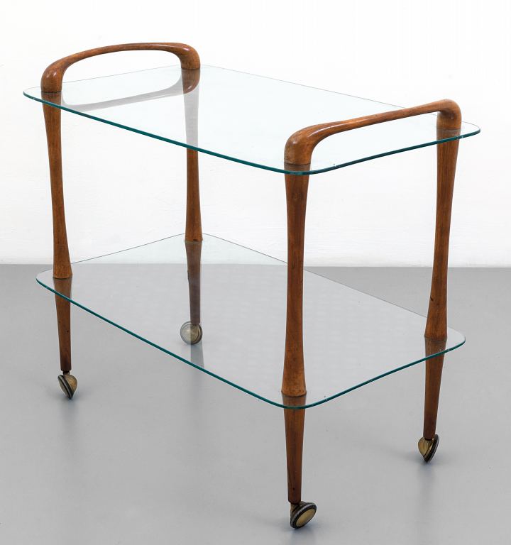 UN CARRELLO, anni '50. Legno di pero, cristallo. Cm 69 (h) x 77 x
