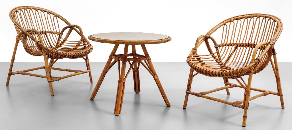 DUE POLTRONCINE E UN TAVOLINO, anni "50. Poltroncine (malacca, bambù, canna...