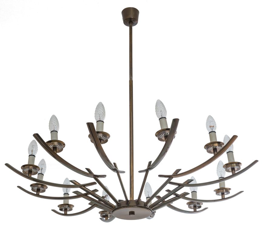 UN LAMPADARIO, anni "50. Ottone. Altezza cm 90, diametro cm 90.