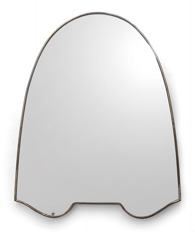 UNO SPECCHIO D PARETE, anni '50. Ottone, cristallo argentato. Cm 72 x 58.
