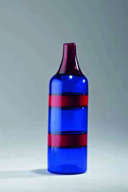 Fulvio Bianconi Bottiglia in vetro a fasce blu e rosso, anni ‘50. Firma ad acido: Venini Murano Italia, altezza cm 33. Reca vecchia etichetta circolare: Venini s.a. Murano. Bibliografia: R. Bossaglia, I vetri di Fulvio Bianconi, Torino, 1993, n. 67