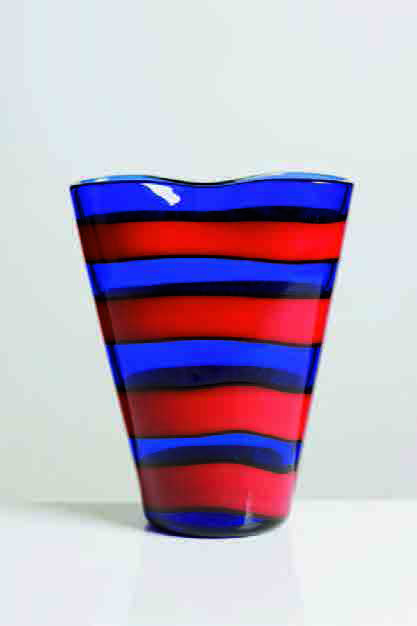 Fulvio Bianconi Vaso a sezione schiacciata in vetro blu a fasce rosse, anni ’50. Tracce di firma ad acido circolare, altezza cm 24