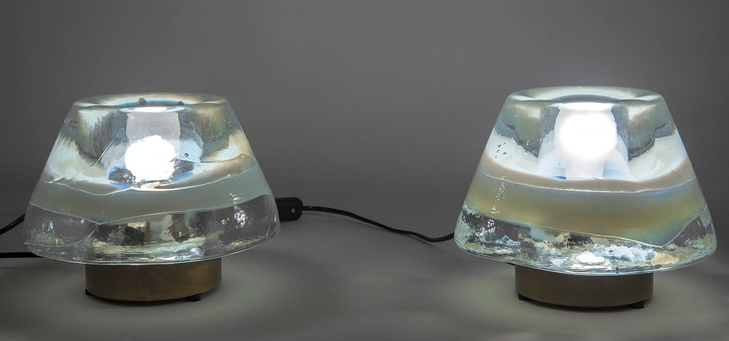 LEUCOS Due lampade da tavolo, anni '70. Ottone, vetro massiccio formato in...