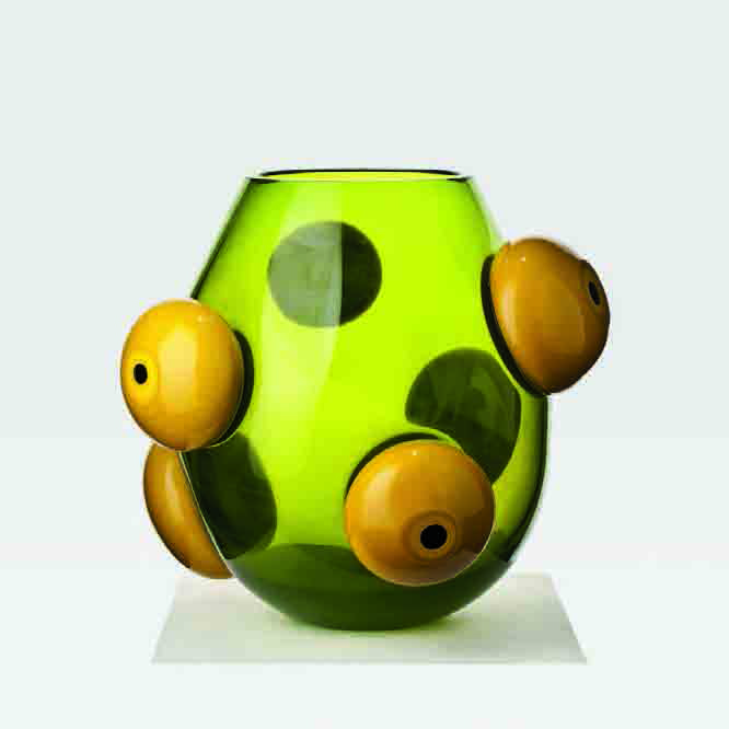 Emmanuel Babled Vaso “Buttons” in vetro verde con applicazioni sferiche senape opaco riportate a caldo, 2005. Firma incisa: Venini 2005 Emm. Babled P.d.A., altezza cm 45