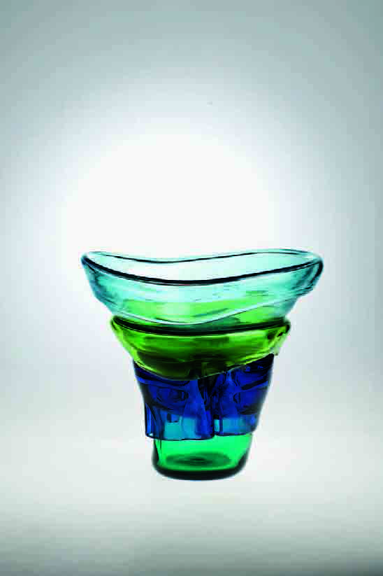 Massimiliano Bonoli Vaso in vetro a incalmi soffiati nei toni dell’azzurro, verde e blu, di forma troncoconica, 2010, cm 29x32